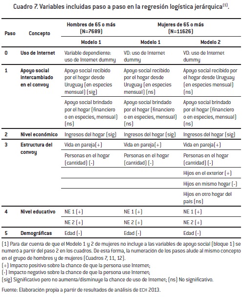 Se observó la asociación con el uso de Internet de las variables incluidas en el estudio. De acuerdo a la naturaleza de las variables, se utilizaron tablas de contingencia (test de chi cuadrado) y comparaciones de medias (t‑Test) entre usuarios y no usuarios de Internet, según el sexo. De esta forma, se seleccionaron las variables del convoy que individualmente se vinculan con el uso de Internet de estos adultos mayores, para analizar luego su interacción a través de un análisis multivariado. Dada la variable dependiente binomial, se realizó una regresión logística jerárquica con el fin de controlar y valorar en qué medida inciden sobre el uso de Internet el apoyo social y la estructura del convoy al interactuar con las otras variables. Se incorporaron en orden jerárquico para controlar las interacciones entre las variables de trabajo. Por ejemplo, la incidencia del nivel de ingresos del hogar en el monto del apoyo social intercambiado. Además, si bien el tipo de hogar (unipersonal, etcétera) no se incorporó en el análisis, al ingresar las variables en la regresión logística se tuvo en cuenta que la cantidad de personas que lo habita puede modificar el total de ingresos del hogar en cuestión y esto se reflejó en la jerarquía de los pasos. Se trabajó con el nivel educativo, indicando al programa spss que se trata de una variable categórica. Se ingresó la variable agrupada en tres categorías para cuidar la cantidad de casos por celda y simplificar el análisis (sin estudios, con primaria finalizada y con al menos liceo concluido). Se utilizó la categoría sin estudios como referencia. Además, se estratificó por género. En definitiva, se trabajó con un modelo que, desde la mirada teórica del convoy social, incorpora algunas variables vinculadas a aspectos estructurales del convoy y del apoyo social. Para las mujeres, se trabajó con un segundo modelo que incluye las variables vinculadas a la cantidad de hijos. Por último, se analizó el impacto de las variables en el uso de Internet entre mujeres y hombres de 65 años o más.