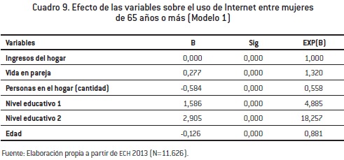 Se usó un primer modelo para hombres y mujeres (Modelo 1) y otro que incorporó las variables relativas a la cantidad de hijos para las mujeres (Modelo 2). En el grupo de hombres, el apoyo social brindado por el hogar resultó no significativo y la variable se quitó del modelo. En el grupo de las mujeres no resultó significativo el apoyo brindado o recibido por el hogar (Modelo 1) y se quitaron ambas variables. En el Modelo 2, la presencia de hijos en otro hogar del país no mostró una asociación significativa y se desechó. En el Modelo 1 (Cuadro 8) el NE 2 tiene el mayor impacto positivo sobre el uso de Internet entre los hombres de 65 años y más. Un hombre mayor que haya finalizado al menos el liceo tiene hasta 24.85 veces más chance de usar Internet que aquel que no ha terminado la primaria. Muy por debajo del impacto de cada nivel educativo, la vida en pareja (1=sí, 0=no) muestra una incidencia positiva sobre el uso de Internet entre los hombres mayores dado que también provoca un incremento en la razón de odds [exp (B) =1.63]. Las variables que provocan un decremento en la razón de odds son: la cantidad de personas en el hogar y la edad En tanto, el total de ingresos del hogar y el apoyo social recibido no inciden en la chance de usar Internet.