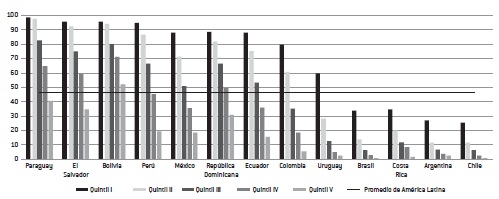 Gráfico 2: América Latina (13 países): niños en hogares sin acceso a internet, por quintil de ingreso, en porcentajes
