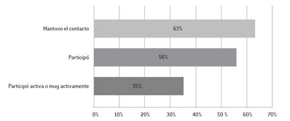 Dentro de los principales resultados se menciona que en la educación secundaria, en promedio, se logró mantener el contacto con el 63% del estudiantado. Sin embargo, cuando se trata de participación en las propuestas educativas por parte de los estudiantes en este período, el porcentaje disminuye a 56% en promedio y a 35% cuando se contabilizan los estudiantes cuya participación fue activa o muy activa. Gráfico 1.