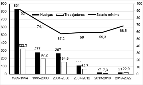 El gráfico 1 ilustra la caída del salario mínimo real y cómo la huelga, en calidad de instrumento legal de presión de los asalariados, fue cada vez menos utilizada. Los salarios reales ya no dependían de las negociaciones entre la empresa, el Estado y los sindicatos, ni de la resistencia de los trabajadores. Según fue expuesto antes, el régimen de acumulación cambió, los sindicatos perdieron fuerza, el Estado se desatendió de las relaciones capital-trabajo y el mercado se convirtió en el referente para las relaciones laborales. Estos cambios tuvieron como fundamento el rompimiento de los pactos establecidos entre las empresas, el Estado y los sindicatos. El corporativismo, por otra parte, estaba en crisis.