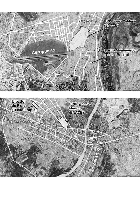 Los barrios de vivienda social presentan contextos urbanos diferentes. En Arequipa, los barrios TP y UPIS se encuentran en un espacio que mezcla lo rural y lo urbano. Se congregan en el distrito de Cayma y presentan un crecimiento limitado, porque se localizan en un territorio accidentado de la sierra sur, atravesado por torrenteras3 (Municipalidad de Cayma, 2015). En Piura, los proyectos de TP se sitúan en el distrito periférico Veintiséis de Octubre, en una planicie costera que es zona de expansión urbana hacia el norte de la ciudad, y la UPIS en un borde del área central de la ciudad (ver figura 2).