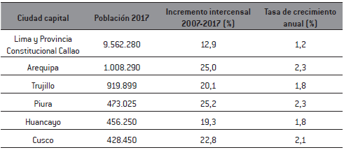 Cuadro 1: Crecimiento poblacional de las principales ciudades capitales de región en Perú, 2007-2017