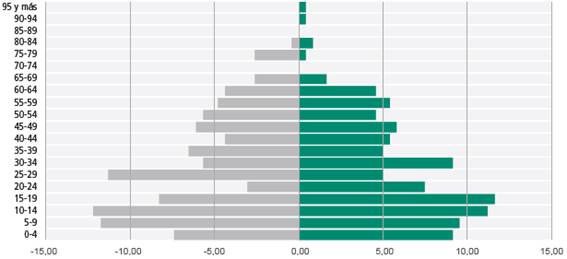 Con respecto a los varones, en el grupo de 15 a 19 años muestran un leve crecimiento respecto al anterior y se observa su disminución entre los 20 y los 29 años, con un aumento en la franja de 30 a 34 años, probablemente debido al retorno. Luego, el porcentaje de varones disminuye, se mantiene prácticamente estable durante los siguientes años y muestra una disminución natural.