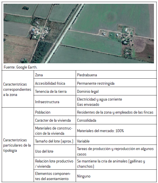 La tipología hábitat rural en caseríos de Piedrabuena, a pesar de su cercanía al pueblo, se caracteriza por configurar islas donde se aglutinan varias viviendas y forman caseríos, que están rodeados por fincas y son parte de ellas, en algunos casos particulares. Esta tipología tiene una relación más directa entre el lote productivo y la vivienda, ya sea porque las viviendas pertenecen a los productores o porque los pobladores de la zona mantienen un espacio para huerta o cría de animales. Sin embargo, las fumigaciones son una fuerte problemática para la producción local. Tabla 2.