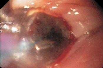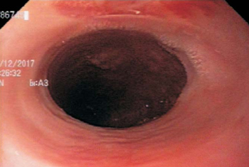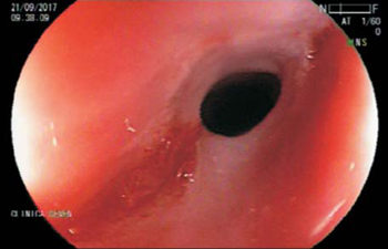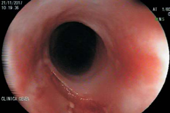 Paciente de sexo femenino de 40 años de edad, sin antecedentes quirúrgicos, negaba uso de medicación habitual, nuligesta. Negaba consumo de alcohol, fumadora de cinco cigarrillos al día desde hace diez años. Concurrió a consulta en policlínica refiriendo disnea progresiva, astenia, adinamia y mareos de diez meses de evolución. En los últimos cuatro meses agregó disfagia intermitente y progresiva para sólidos. No presentó episodios de impactación de alimentos ni adelgazamiento. Del examen físico se destacaba la presencia de piel y mucosas hipocoloreadas, queilitis angular bilateral, glositis y coiloniquia. Presión arterial de 120/80 mmHg, frecuencia cardíaca 85 pulsaciones por minuto, apirética. No se palparon adenopatías en ningún territorio, la exploración pleuropulmonar y cardiovascular fueron normales. De la paraclínica se destacaba una anemia microcítica e hipocrómica por déficit de hierro; hemoglobina 8,2 g/dL, VCM 53 fl, Hto 29%, HCM 16 pg, ferritina 3,7 ng/ml, sideremia 22 ug/dl e índice de saturación de transferrina 7%. El perfil lipídico, TSH, glicemia, hepatograma, PEF, VES y función renal fueron todos normales. Se realizó un esofagogastroduodeno por doble contraste que informó una estenosis subcricoidea con buen pasaje distal (figura 1). Se sometió posteriormente a una gastroscopía digestiva alta que objetivó inmediatamente por debajo del cricofaríngeo una membrana grisácea estenosante que no permitía el paso del endoscopio (figura 2). Se procedió a realizar dilatación mediante balón hidroneumático de expansión radial, no se registraron complicaciones durante el procedimiento (figura 3) y (figura 4). A las seis semanas concurrió a control endoscópico refiriendo mejoría leve de la disfagia, se objetivó nuevamente la membrana estenosante y se realizó segunda sesión de dilatación con balón (figura 5). Posteriormente, presentó mejoría completa de su sintomatología realizando al momento dieta habitual sin dificultad para la deglución de sólidos, concurriendo a control endoscópico a las cuatro semanas, se observó restos de membrana y tejido fibrótico en tercio superior con pasaje sin dificultad del endoscopio (figura 6). En forma complementaria se realizó tratamiento con hierro por vía oral hasta lograr cifras normales de hemoglobina, sideremia y ferritina. Con los hallazgos clínicos y paraclínicos descritos se pudo establecer con seguridad el diagnóstico de SPV.