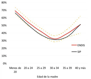 De hecho, ENDIS 2013 encontró que el 47,7% de las mujeres con hijos menores de 4 años no querían quedar embarazadas, porcentaje casi idéntico al obtenido en los datos del Sistema Informático Perinatal (SIP) para el año 2012 (46%). Asimismo, se pudo observar que a menor edad de la madre al momento del parto y menor volumen de ingresos en el hogar aumentaba la probabilidad de haber cursado un embarazo no intencional17. La distribución por edad es asimismo casi idéntica en ambas fuentes (figura 1).