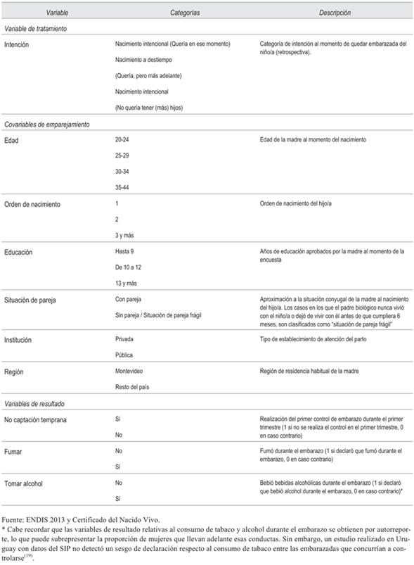os nascimentos não intencionais e prematuros (não desejados no momento) são considerados dois grupos de tratamento e comparados com o grupo de partos intencionais. O efeito líquido da intencionalidade da gravidez sobre as práticas de saúde durante a gravidez é examinado usando técnicas de correspondência de pontuação de propensão (PSM). São utilizados os dados da Pesquisa de Nutrição, Desenvolvimento Infantil e Saúde (ENDIS), um estudo de painel que coleta informações desde 2013 de mães com filhos de 0 a 3 anos em domicílios localizados em áreas urbanas do Uruguai (mais de 5.000 habitantes).