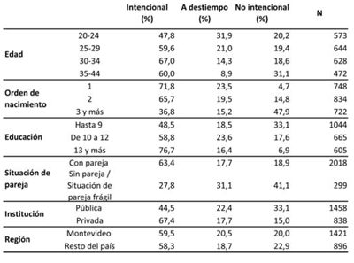 El objetivo de este trabajo es profundizar en el análisis de la intencionalidad de los embarazos en Uruguay, con énfasis en el estudio de los vínculos entre intencionalidad del embarazo y cuidados prenatales (captación temprana del embarazo y prácticas saludables durante la gestación). Se consideran dos subcategorías de embarazos no intencionales: los embarazos no intencionales propiamente dichos (no buscados ni esperados en absoluto) y los embarazos a destiempo (no buscados en ese momento).