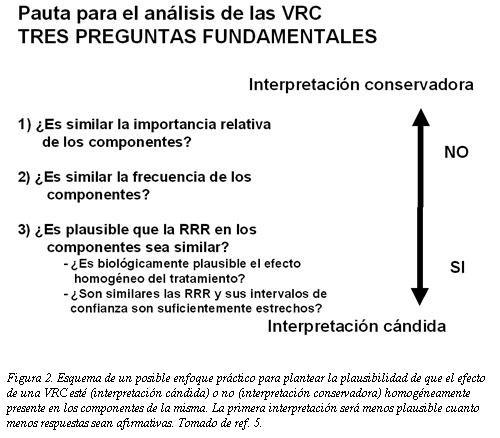 No sólo existen algunas características del efecto observado en los componentes de la VRC que permiten afirmar, en algunos casos, que es plausible que exista un efecto sobre alguno de ellos, sino que en ocasiones se podrá incluso plantear la hipótesis de que dicho efecto se aplica de manera consistente a todos los componentes (interpretación cándida). Nosotros, en colaboración con el Departamento de Epidemiología de la Universidad Mc Master en Ontario (5), hemos desarrollado un algoritmo (figura 2) para el análisis estimativo del efecto de una intervención sobre los componentes de la VRC según el cual, y de acuerdo a la respuesta que demos a tres preguntas relativas a la homogeneidad de dichos componentes y las características del efecto de la intervención, podremos estimar como más o menos plausible la existencia de un efecto homogéneo de la intervención sean sobre ellos. Cuanto más afirmativas las respuestas a dichas preguntas, más plausible será la interpretación cándida (efecto de la intervención sobre todos los componentes de la VRC), mientras que cuanto más negativas sean, más conservadora tendrá que ser nuestra interpretación (efecto sobre la VRC en su conjunto sin poder afirmar cuál es el efecto en los componentes).