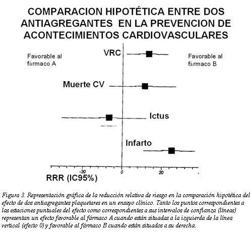 No siempre las cosas son tan sencillas, y a veces esta interpretación pueda resultar opinable. Imaginemos un ensayo clínico en el que se comparan dos fármacos antiagregantes para la prevención de acontecimientos cardiovasculares, utilizando una VRC integrada por muerte, ictus e infarto de miocardio durante el seguimiento. Los resultados de ese ensayo hipotético se representan en el diagrama de la figura 3, en el que, como es usual en este tipo de gráfico, la línea vertical representa una RRR de 0 (ausencia de efecto), indicando tanto la estimación puntual como los intervalos de confianza a la derecha o izquierda de esta línea un efecto predominante de uno u otro fármaco. Como puede comprobarse, la RRR de la VRC es claramente favorable a uno de los fármacos (llamémosle B, con todo su intervalo de confianza a la derecha de la línea de ausencia de efecto). Si nos formulamos ahora las tres preguntas propuestas podemos llegar a las respuestas siguientes: 1) No existe un marcado gradiente de importancia clínica entre los componentes de la VRC (damos por supuesto que los autores han definido bien los ictus con secuelas y los infartos de miocardio no mínimos). 2) La frecuencia de aparición de acontecimientos no fue claramente dispar (este dato no se representa en la figura). 3) Es más problemática la conclusión sobre una RRR concordante y homogénea. Los valores correspondientes al infarto de miocardio son similares, incluso más favorables al mismo fármaco. La estimación puntual de la RRR de muerte va en el mismo sentido, pero su intervalo de confianza, además de más ancho, abarca también la zona favorable al fármaco B. Su interpretación, por tanto, sería más dudosa. Pero el efecto sobre el ictus es llamativo: no sólo la estimación puntual del efecto del fármaco favorece al fármaco A, sino que la mayor parte del intervalo de confianza de la RRR es también favorable a él (en ausencia de normas concretas, parece razonable exigir que no haya discrepancias cualitativas o direccionales entre el efecto sobre los componentes, como las hay en este caso, para asumir un efecto homogéneo sobre los mismos). Concluimos, pues, que aunque la respuesta a las dos primeras preguntas es afirmativa, el comportamiento de las RRR no permite, en este ejemplo hipotético, suponer como muy plausible que el efecto de uno de los fármacos sea superior al otro de forma homogénea en la prevención de muerte, ictus e infarto, aunque el efecto sobre la combinación de acontecimientos lo sea.
