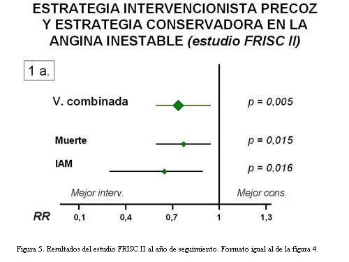 Lo interesante de este ejemplo es que los autores publicaron posteriormente los resultados observados al año del seguimiento (7). El mayor número de acontecimientos permitió ya observar unos hallazgos (tabla 2, figura 5) que confirman incuestionablemente la interpretación “cándida” que hubiera podido defenderse a los seis meses de seguimiento. Los intervalos de confianza se alejaban aun más de la línea de ausencia de efecto y, a mayor abundamiento, el efecto era estadísticamente significativo para los dos componentes a un nivel difícilmente explicable como espurio.