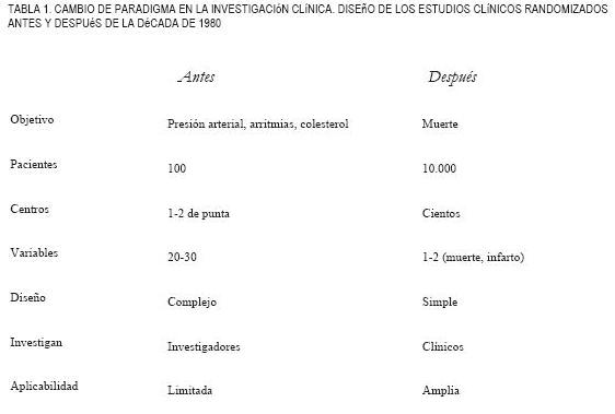 A mediados de los 80, el Instituto Mario Negri de Milán y la Universidad de Oxford implementaron la investigación clínica de poblaciones, la que vendría a cambiar esta situación (1,2). Estos grupos desarrollaron estudios clínicos randomizados de diseño simple pero metodológicamente riguroso, para tratar de dar respuesta a problemas importantes del área cardiovascular (3). Este tipo de investigación clínica implicó un cambio de paradigma en relación con lo que era la investigación hasta entonces (tabla 1).