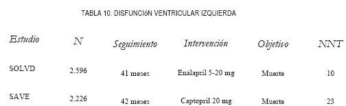 En la década anterior el enalapril había demostrado reducir la mortalidad en pacientes con insuficiencia cardíaca en clase funcional IV. En 1991 el estudio SOLVD mostró que este fármaco también era efectivo en pacientes con insuficiencia cardíaca en clase funcional II y III (19) (tabla 10). Al año siguiente el estudio SAVE demostró que el captopril era capaz de prevenir el desarrollo de falla cardíaca en pacientes post IAM asintomáticos y con fracción de eyección (FE) <40% (20). Lo mismo sucedió en el estudio SOLVD: prevención en pacientes con FE <35% tratados con enalapril (21). En este caso no se demostró reducción de la mortalidad, dado que esta es relativamente baja en los pacientes asintomáticos con baja FE, pero sí hubo reducción del desarrollo de insuficiencia cardíaca y de las internaciones.