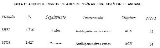 En 1992 el estudio norteamericano SHEP en pacientes mayores de 60 años con hipertensión arterial sistólica (PA sistólica >160 mmHg y PA diastólica <90 mmHg) demostró que el tratamiento antihipertensivo reducía la incidencia de ACV (23) (tabla 11). El estudio sueco STOP, realizado en pacientes de 70 a 84 años, también mostró reducción del ACV con el tratamiento antihipertensivo (24). Estos estudios dieron por tierra con el concepto de que la presión arterial (PA) sistólica elevada en el anciano era normal al demostrar que reduciendo la PA sistólica se reducía la incidencia de ACV.