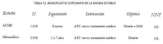 Desde su introducción la angioplastia coronaria (ATC) mostró ser efectiva en la reducción de la angina. En 1992 se publicó el primer ensayo clínico randomizado que comparó ATC con tratamiento médico en angina estable (ACME), no mostrando diferencia en el evento combinado de muerte o IAM entre ambos tratamientos (25) (tabla 12). Luego de este se realizaron otros diez ensayos clínicos randomizados en pacientes con angina estable, los que se analizaron en un metaanálisis publicado en 2005. Este estudio totalizó 2.950 pacientes mostrando que la ATC no reduce la mortalidad ni previene el IAM entre estos pacientes cuando se le compara al tratamiento médico (26) (tabla 12).