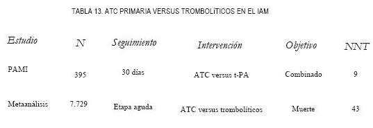 En 1993 el estudio PAMI comparó el efecto de la ATC primaria versus t-PA en pacientes con IAM con menos de 12 horas de evolución, siendo el primero de una serie de ensayos clínicos randomizados que compararon estos dos tratamientos (27) (tabla 13). Este estudio mostró reducción del evento combinado de muerte, reinfarto o ACV. En 2005, un metaanálisis que incluyó los 23 estudios realizados al respecto mostró superioridad de la ATC sobre los trombolíticos (28). La evidencia actual muestra que en las tres primeras horas de evolución del IAM los trombolíticos son tan efectivos como la ATC, mientras que después de las tres y hasta las 12 horas de evolución la ATC es superior (29,30).
