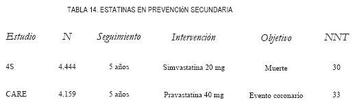 En 1994 el estudio 4S (31) en pacientes con coronariopatía e hipercolesterolemia mostró que la simvastatina reduce la mortalidad, lo que posteriormente sería refrendado por el estudio LIPID (32) con pravastatina (tabla 14). En 1996 el estudio CARE mostró que la pravastatina reducía eventos en pacientes con IAM y niveles de colesterol habituales (33). De esta forma se demostró que las estatinas, más allá de bajar los niveles de colesterol, eran capaces de prevenir los eventos cardiovasculares en pacientes con afección vascular previa, sin aumentar la mortalidad por cáncer como había sido sugerido previamente.