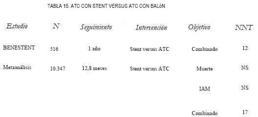 En 1994 el estudio BENESTENT comparó la ATC con stent con la ATC con balón en relación a un objetivo combinado de muerte, IAM, ACV, revascularización y by-pass (tabla 15). El estudio mostró reducción del objetivo combinado al cabo de un año. Al analizar los eventos por separado se observa que no hubo diferencia en mortalidad en IAM, en ACV, ni en by-pass. La única diferencia radicó en la necesidad de revascularización.