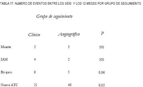 Luego del seguimiento a los seis meses (y hasta los 12 meses) no existió diferencia significativa en mortalidad, IAM, y by-pass coronario entre ambos grupos, pero existió casi el doble de nueva ATC en el grupo de control angiográfico (tabla 17).