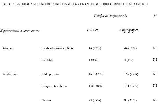 Luego de los seis meses no hubo diferencias en angina estable/isquemia silente, angina inestable ni en el uso de fármacos entre ambos grupos de seguimiento (tabla 18).