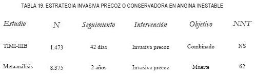 En 1994 se publicó el estudio TIMI-IIIB, el que analizó una estrategia invasiva precoz versus una estrategia conservadora en pacientes con angina inestable o IAM no Q (35) (tabla 19). El mismo no mostró beneficio en el objetivo combinado de muerte, IAM, y ergometría positiva. Luego de este estudio se han realizado otros seis ensayos clínicos randomizados destinados a dar respuesta a esta misma pregunta. El estudio más reciente (ICTUS) mostró que en pacientes con angina inestable con troponina positiva no existía beneficio de una estrategia invasiva precoz en un objetivo combinado de muerte, IAM, o reinternación (36). En 2006 un metaanálisis de estos siete estudios mostró que una estrategia invasiva precoz reduce la mortalidad, el IAM, y la rehospitalización (37) (tabla 19), aunque los autores de ICTUS plantean que si se analizan juntos los tres estudios más recientes (y por ende los que han tenido manejo médico optimizado) esa diferencia no existe (38).