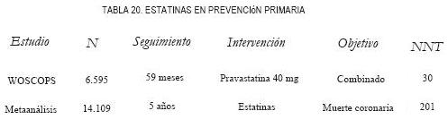 En 1995 el estudio WOSCOPS mostró que en hombres con hipercolesterolemia sin enfermedad coronaria, la pravastatina reducía el objetivo combinado de IAM o muerte cardiovascular (39) (tabla 20). Los estudios AFCAPS/TEXCAPS (40) y ACAPS (41) mostrarían resultados similares. Un metaanálisis de estos tres estudios mostró que además de reducir los eventos cardiovasculares no fatales, las estatinas reducen la mortalidad de causa coronaria (42).