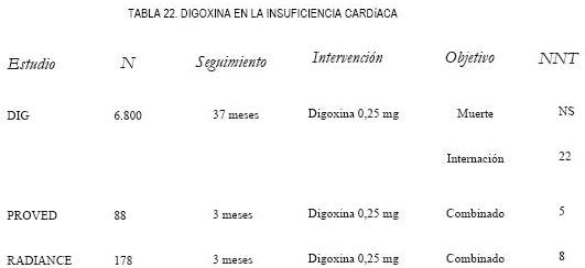 En 1997 se publicó el estudio DIG, que mostró que la digoxina no tenía efecto en la mortalidad de pacientes con insuficiencia cardíaca en ritmo sinusal, pero que reducía de forma significativa la necesidad de internación (49) (tabla 22). Otros dos estudios mostraron que al suspender la digoxina a los pacientes con insuficiencia cardíaca que estaban tratados con este fármaco se deterioraba su sintomatología (50,51).