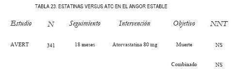 En 1999 el estudio AVERT comparó en pacientes con angor estable e hipercolesterolemia el tratamiento con 80 mg de atorvastatina versus ATC (52) (tabla 23). Su objetivo combinado incluyó muerte cardiovascular, IAM, ACV, revascularización o internación. Al cabo de 18 meses no se observó diferencia en el objetivo combinado ni en mortalidad, IAM, ACV, revascularización o internación. Los pacientes incluidos tenían lesión en dos vasos (43%), y de descendente anterior en un porcentaje similar.