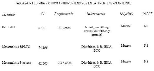 Recién en el año 2000, luego de haber sido tratados millones de pacientes en el mundo con nifedipina desde su introducción al mercado en 1972, el estudio INSIGHT demostró que este fármaco no aumentaba la mortalidad como había sido sugerido (56) (tabla 24). Este es otro de los ejemplos de lo que era la práctica de la medicina cardiovascular antes y lo que es la práctica actual. Hoy día nos parece increíble que se haya empleado un tratamiento con tanta frecuencia (hasta mediados de la década de lo 1990 los bloqueantes de los canales de calcio eran el grupo de antihipertensivos más vendido en EE.UU. y España) sin conocer su efecto sobre la mortalidad, pero pensemos que esa era la regla hasta entrados los 80. El estudio NORDIL mostró similares resultados con diltiazem y con diuréticos/ß-bloqueantes en el objetivo combinado de ACV, IAM, o muerte cardiovascular (57).