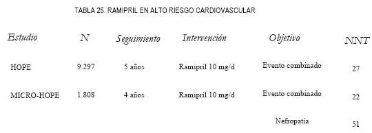 El estudio HOPE, publicado en 2000, mostró que el ramipril era efectivo para prevenir el objetivo combinado de IAM, ACV, y muerte cardiovascular en pacientes de alto riesgo (60) (tabla 25). Si bien el estudio no fue diseñado para evaluar mortalidad, esta fue reducida con el tratamiento investigado. El estudio MICRO-HOPE, realizado en diabéticos con riesgo cardiovascular elevado, mostró reducción del evento combinado de IAM, muerte cardiovascular, y ACV (61). Asimismo, este estudio mostró prevención del desarrollo de nefropatía (tabla 25).