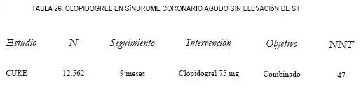 En 2001 se publicó el estudio CURE, el que analizó el efecto del clopidogrel sumado al ácido acetilsalicílico en pacientes con síndrome coronario agudo sin elevación de ST (62) (tabla 26). Este estudio evaluó un objetivo combinado de muerte cardiovascular, IAM, y ACV, el que fue reducido con la combinación de fármacos estudiada.