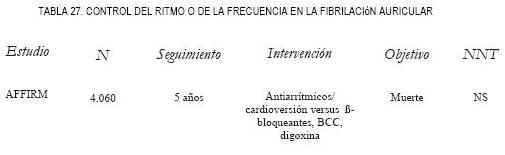 El estudio AFFIRM en 2002 exploró si era mejor el control del ritmo o de la frecuencia en pacientes con fibrilación auricular y factores de riesgo para ACV (63) (tabla 27). El mismo no mostró diferencias en cuanto a mortalidad ni en relación a sangrado, ACV isquémico, ni mortalidad.