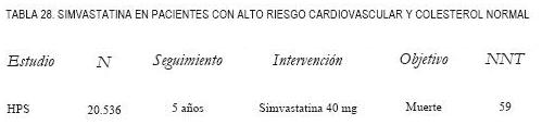 El estudio HPS evaluó en 2002 si en pacientes de alto riesgo cardiovascular una alta dosis de simvastatina podía prevenir la mortalidad (64) (tabla 28). El estudio comprobó que esto era así, siendo lo más novedoso del mismo que este efecto se observó entre pacientes con colesterol >6,0 mmol/l (232 mg/dl), entre pacientes con colesterol de 5,0-5,9 mmol/l y con colesterol <5 mmol/l (193 mg/dl), lo que muestra que esta droga es igualmente efectiva en prevenir la muerte más allá del nivel del colesterol plasmático.