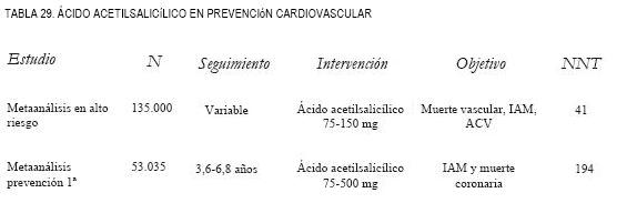 Numerosos estudios han investigado el empleo del ácido acetilsalicílico en pacientes con diferentes niveles de riesgo cardiovascular. Un metaanálisis de 287 ensayos clínicos en pacientes con alto riesgo cardiovascular mostró que cuando existen antecedentes de IAM, AIT, ACV, y arteriopatía periférica, este fármaco previene el IAM, ACV y muerte vascular (65) (tabla 29). En los pacientes sin enfermedad cardiovascular, un metaanálisis mostró que el ácido acetilsalicílico previene el riesgo del evento combinado de IAM y muerte coronaria (66) (tabla 29). El mismo mostró aumento del riesgo de ACV hemorrágico y de hemorragia digestiva con el ácido acetilsalicílico, pero los beneficios superaron a los riesgos de sangrado en los pacientes con riesgo cardiovascular mayor a 1%. En los individuos de bajo riesgo (<1% por año) el riesgo de sangrado supera a los beneficios de esta terapéutica.