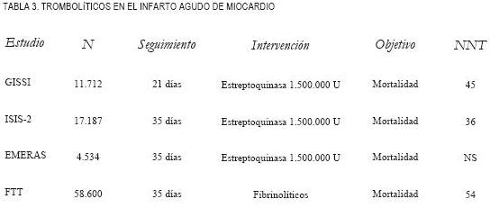 El estudio sudamericano EMERAS (en el que participaran varios centros de Montevideo y del interior de nuestro país), evaluó el efecto de la estreptoquinasa en pacientes con IAM entre seis y 24 horas de evolución, pero no tuvo la cantidad de pacientes necesaria para demostrar o descartar el beneficio de la trombolisis tardía (9). El metaanálisis de todos los ensayos clínicos que incluyeron a más de 1.000 pacientes FTT (Fibrinolytic Therapy Trialists) permitió demostrar que la trombolisis es beneficiosa entre las cero y las 12 horas de iniciado el cuadro, siendo mayor el beneficio cuanto más precoz sea el tratamiento (10) (tabla 3).