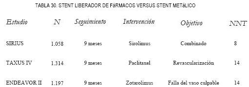 En 2003 el estudio SIRIUS comparó, en pacientes coronarios de bajo riesgo, el stent con sirolimus versus el stent metálico en relación con un objetivo que combinaba muerte, IAM, o nueva revascularización (67) (tabla 30). El mismo no mostró diferencias en mortalidad ni en IAM entre ambos dispositivos, la ventaja del stent con sirolimus radicó en la menor tasa de nueva revascularización. En 2004 el estudio TAXUS IV comparó el stent con paclitaxel con el stent metálico en relación con el objetivo revascularización (68) (tabla 30). Al igual que en el anterior se observó reducción de la indicación de nueva revascularización, no existiendo diferencia en relación con la muerte ni el IAM. En base a los resultados de estos dos estudios la Food and Drug Administration (FDA) de EE.UU. aprobó su empleo. El año pasado se conocieron los resultados de un estudio con zotarolimus (ENDEAVOR II), el que mostró mayor falla del vaso culpable en el grupo de pacientes tratados con stent metálico (69) (tabla 30).