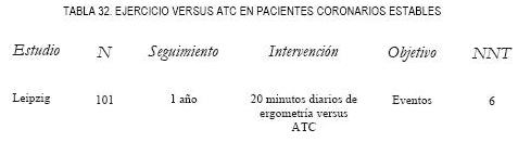 En 2004, un estudio de la Universidad de Leipzig en pacientes coronarios estables mostró que la realización de ejercicio regular es superior a la ATC en la reducción de eventos y en la progresión de las lesiones ateroescleróticas (74) (tabla 32). El control de síntomas fue similar con ambos tratamientos. Si bien este es un estudio pequeño y sus conclusiones no pueden ser tomadas como definitivas, plantea la hipótesis de que un tratamiento como el ejercicio, dirigido a mejorar la carga de enfermedad coronaria, es tanto o más efectivo que las intervenciones puntuales en las lesiones angioplastiables existentes. Es de destacar que en este estudio casi la mitad de los pacientes tenían lesiones en dos o tres vasos. Al igual que el estudio AVERT, este resultado deja planteada una hipótesis, la que debería ser validada con un estudio de diseño apropiado para ello.