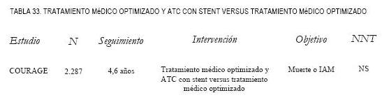 Recientemente se publicaron los resultados del estudio COURAGE realizado en EE.UU. y Canadá en pacientes con cardiopatía isquémica estable (75). En el mismo se comparó si una estrategia de terapéutica médica óptima y ATC con stent era superior a la terapéutica médica óptima sola en la prevención de la muerte y el IAM. Este estudio, al igual que lo que había sucedido en el metaanálisis de 2005 en pacientes coronarios estables, no mostró beneficio de la ATC sobre el tratamiento médico óptimo (tabla 33). Lo interesante de este estudio es que si bien reafirma lo que se conocía, en el mismo más de 20% de los pacientes tenían angina clase III; 68% de ellos presentaban múltiples defectos reversibles de perfusión; 30% tenían lesiones en tres vasos y 37% tenían lesión de DA proximal. El estudio COURAGE, por lo tanto, valida con su resultado la hipótesis planteada por los estudios AVERT y Leipzig, y muestra que en pacientes coronarios estables debe realizarse tratamiento médico y reservarse la revascularización para cuando exista empeoramiento de la situación clínica que no sea manejable con tratamiento médico óptimo.