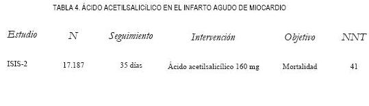 El estudio ISIS-2, además del tratamiento trombolítico evaluó mediante su diseño factorial 2 x 2, el efecto del ácido acetilsalicílico en el IAM, observando una reducción de la mortalidad de la misma magnitud que la observada con el tratamiento fibrinolítico (2) (tabla 4). Este hallazgo fue muy importante pues muestra cómo un tratamiento sencillo, el que puede ser administrado en cualquier contexto asistencial, tiene un beneficio de similar magnitud al del tratamiento de reperfusión.
