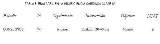 En 1987 el estudio escandinavo CONSENSUS mostró que el enalapril reducía en 54% la mortalidad de los pacientes con insuficiencia cardíaca clase IV. El impacto de este tratamiento es tan importante que por cada seis pacientes en clase IV que son tratados con 20-40 mg diarios de enalapril durante seis meses se evita una muerte (11) (tabla 5).