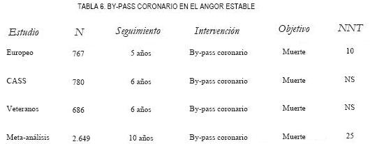 Desde su introducción quedó claro que el by-pass era muy efectivo para el alivio de la angina. Entre 1982 y 1984 se publicaron los ensayos clínicos randomizados que evaluaron el efecto del by-pass coronario sobre la mortalidad en pacientes con angina estable. El primero de ellos, el estudio Europeo, mostró reducción significativa de la mortalidad con esta terapéutica, pero ni el estudio CASS ni el de la Administración de Veteranos mostraron dicho beneficio (12) (tabla 6). Los resultados divergentes observados se explican por el escaso número de pacientes y la baja mortalidad observada en estos estudios *. La información cambió en 1994 cuando se publicó un metaanálisis de la evolución a diez años de los pacientes de los tres estudios (lo que acumuló mayor número del evento muerte) y de otros cuatro más pequeños totalizando 2.649 pacientes (12). A los diez años la incidencia de la mortalidad fue 30% en el grupo de tratamiento médico y como la reducción de riesgo relativo esperada era de 20%, con 2.300 pacientes fue suficiente para demostrar el beneficio de esta terapéutica (tabla 6).