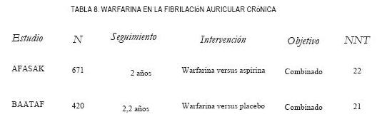 En 1989 el estudio AFASAK demostró que en pacientes con fibrilación auricular crónica la warfarina prevenía la incidencia de eventos combinados (ACV, accidente isquémico transitorio, embolia periférica, embolia sistémica) en relación con placebo y aspirina (14) (tabla 8). Resultados similares fueron observados con el estudio BAATAF en 1990 (15).