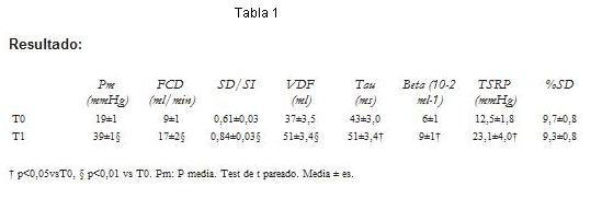 Método: se midieron el flujo pulmonar (FP, Transonic), las presiones arterial pulmonar (P), VD y aórtica (PA) (Millar), el flujo coronario derecho (FCD) y los diámetros SD y SI (sonomicrometría) en 15 ovejas anestesiadas. Completada la instrumentación (T0), se realizó la embolización progresiva (30 min, T1) con coágulos de sangre autóloga hasta alcanzar un cociente SD/SI entre 0,8 y 0,9. Las funciones sistólica y diastólica del VD fueron estimadas a partir el bucle presión-volumen (catéter de conductancia) mediante el trabajo sistólico reclutable por precarga (TSRP), y el volumen diastólico final (VDF), la constante de tiempo (Tau) y la constante rigidez (Beta) ventriculares, respectivamente. Se estimaron la motilidad de la pared libre del VD mediante el porcentaje de acortamiento de SD (%SD), y el estrés parietal (EP) como PVDxSD. Se cuantificó la cTnI (Biosite).