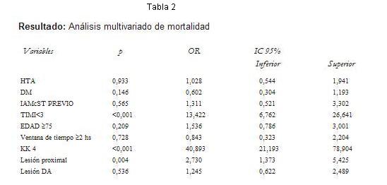 Conclusión: se mantienen los predictores independientes de mortalidad intrahospitalaria el shock cardiogénico y el flujo distal TIMI < 3 postprocedimiento. Se identificó además a la lesión proximal de la arteria culpable.