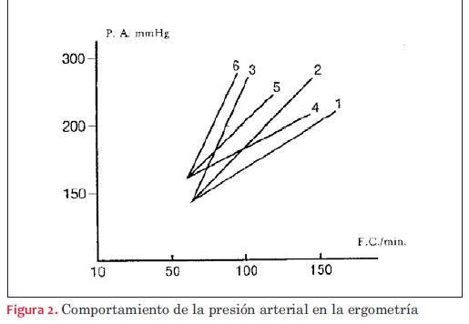 Si comparamos en la figura 2 las cifras tensionales con la frecuencia cardíaca (FC), en sujetos que no padecen alguna patología especial, como déficit cronotrópico o que sufran de falla de bomba, vemos que hay una relación directa entre la FC y la PA. Son todas curvas (2) que muestran una relación directamente proporcional de ambos valores; pero estas curvas pueden tener pendientes muy diferentes. Pueden partir de cifras normales, como pasa en las curvas 1, 2, 3 y, a partir de las cifras normales, pueden mantenerse normales durante el esfuerzo (curvas 1 y 2) o puede hacerse patológica durante el esfuerzo (curva 3).