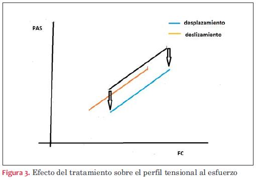 Las curvas sirven para estudiar fármacos. Los fármacos que disminuyen la FC además de la PA, como pueden ser los betabloqueantes, desplazan la curva en una forma que se ha denominado “por deslizamiento”. Por otra parte, los fármacos como los anticálcicos o los diuréticos bajan solamente la presión, manteniendo las mismas cifras de FC y tenemos una curva de acción terapéutica “por desplazamiento” de la pendiente (figura 3).