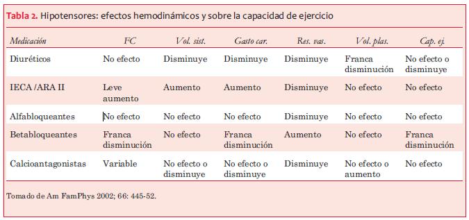 En el caso de un hipertenso en tratamiento medicamentoso la ergometría nos servirá para evaluar la respuesta de la PA y la capacidad de ejercicio bajo medicación. En la tabla 2 se pueden apreciar las modificaciones hemodinámicas y sobre la capacidad de ejercicio de los fármacos más usados en el tratamiento de la HTA. Como puede verse, serían de elección los IECA/ARA II y los calcioantagonistas por sus efectos hemodinámicos y por no afectar la capacidad de esfuezo.