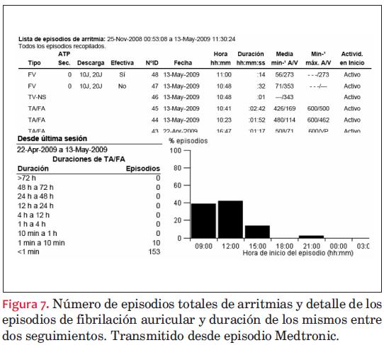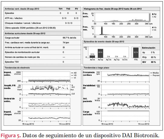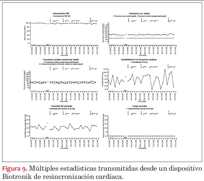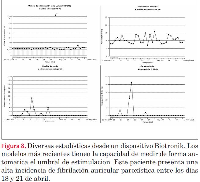 - Datos de la frecuencia del paciente: frecuencia ventricular media, incidencia de arritmias, cambios de modo, variabilidad del ritmo cardíaco, etcétera. Un aspecto cada vez más valorado es conocer la incidencia de episodios de fibrilación auricular asintomática, por el riesgo de fenómenos embólicos y la necesidad de anticoagular. Estos datos nos darán información relacionada directamente con el estado del paciente.