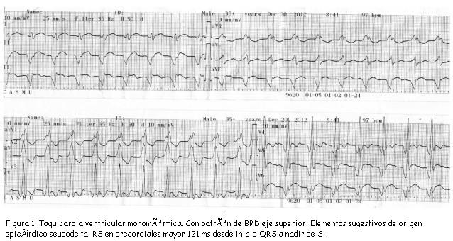 Varón de 80 años proveniente de Montevideo, con antecedentes de hipertensión arterial, fibrilación auricular paroxística y persistente, y portador de una miocardiopatía dilatada idiopática con moderada disfunción sistólica del ventrículo izquierdo en clase funcional II (NYHA). Portador, además, de un cardiodesfibrilador automático implantable (DAI) por taquicardia ventricular monomorfa sostenida (TVMS). Consulta por disnea de esfuerzo progresiva de corta evolución. No palpitaciones, no síncope; no terapias del DAI. Al ingreso, normotenso, con escasos elementos de falla cardíaca. El electrocardiograma (ECG) muestra una TVMS con una frecuencia de 130 pm (por debajo de la frecuencia de detección programada para el generador) con patrón de bloqueo de rama derecha y eje superior. Se trata con fármacos antiarrítmicos: amiodarona, lidocaína, propafenona y también con terapia eléctrica: sobreestimulación y CVE. Con estimulación antitaquicardia y CVE la arritmia se interrumpe, pero en segundos se reinstala espontáneamente. Con diagnóstico de TVSM incesante y luego de múltiples CVE, se decide intentar ablación por catéter con radiofrecuencia. Este procedimiento se realiza en otro centro, guiado por mapeo endocárdico de activación, y no consigue suprimir la taquicardia.